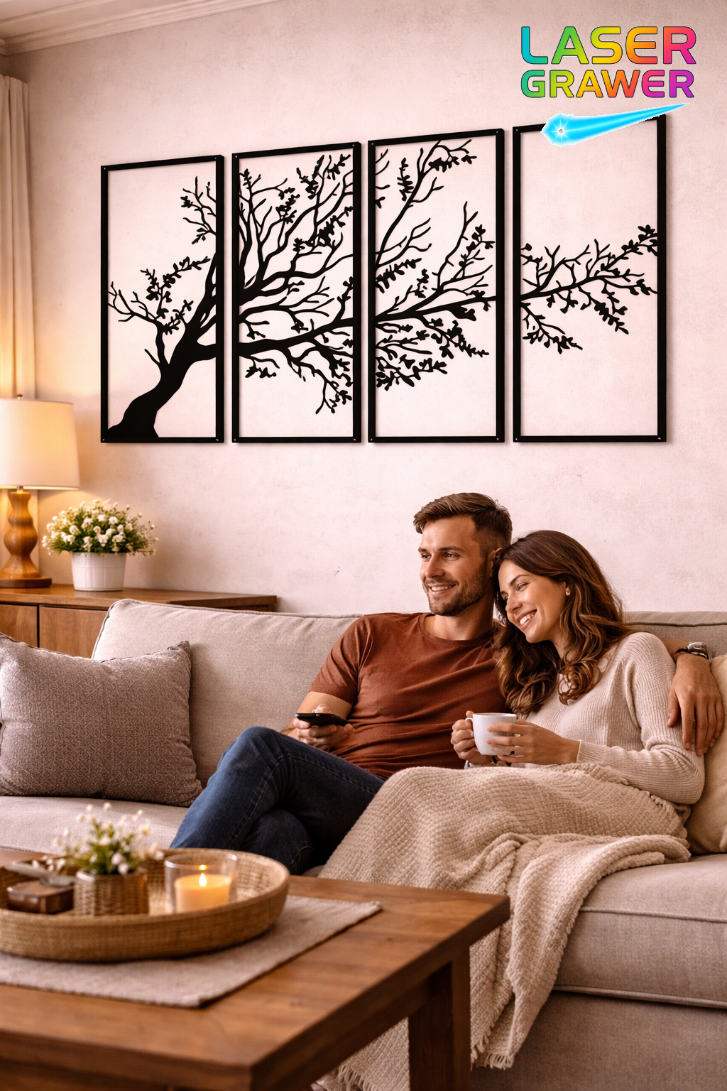 Nowoczesna dekoracja ścienna przedstawiająca drzewo rozłożone na cztery panele, tworzące spójną i efektowną kompozycję. Motyw drzewa symbolizuje życie, rozwój oraz harmonię, a jego rozciągnięta forma nadaje wnętrzu lekkości i przestrzeni.